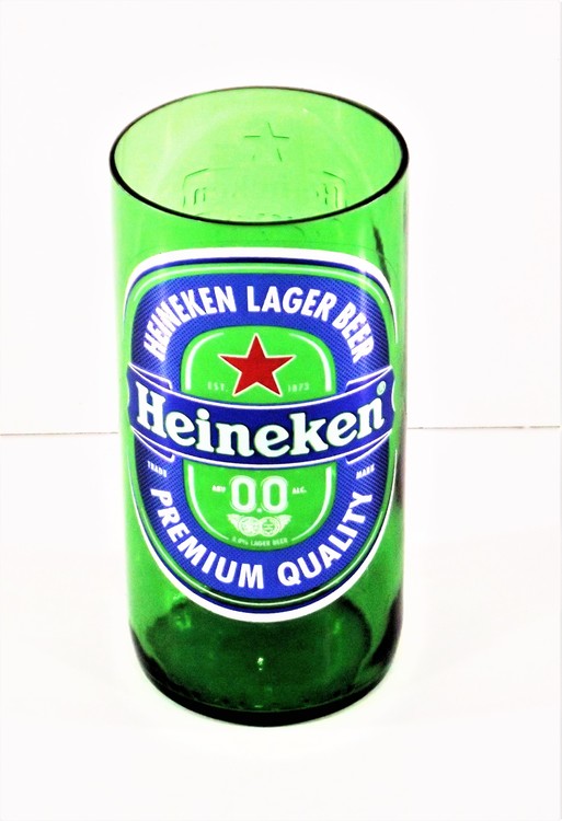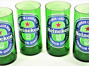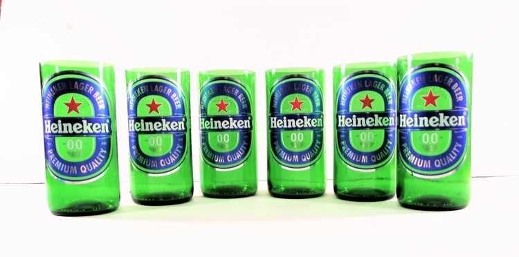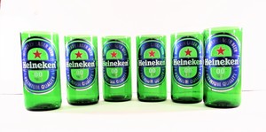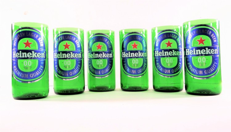 A set of 6 green glasses with colorful stickers hand-made from Heineken beer bottles.