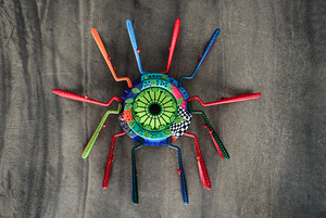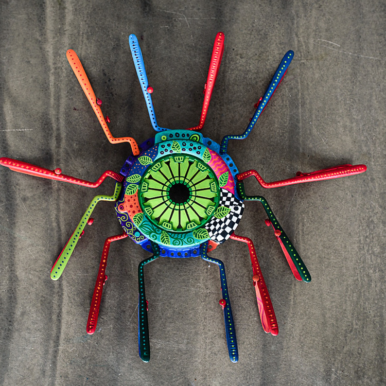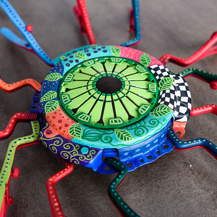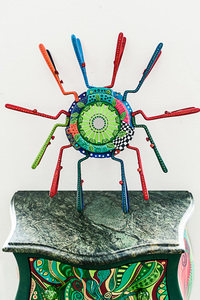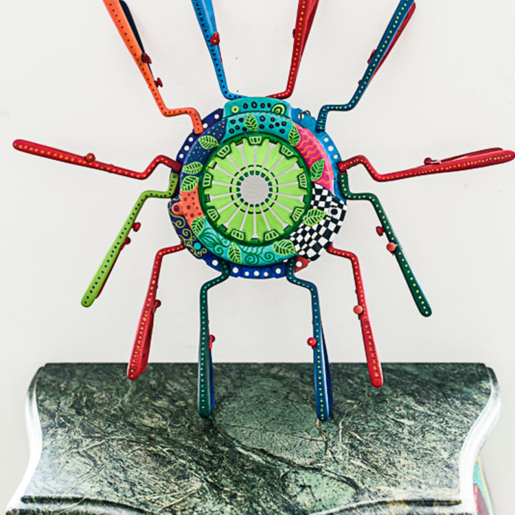 The Aztec Cockchafer is a sculpture created from jaw spreaders and a car clutch decorated with fabulous patterns by Luiza Poreda.