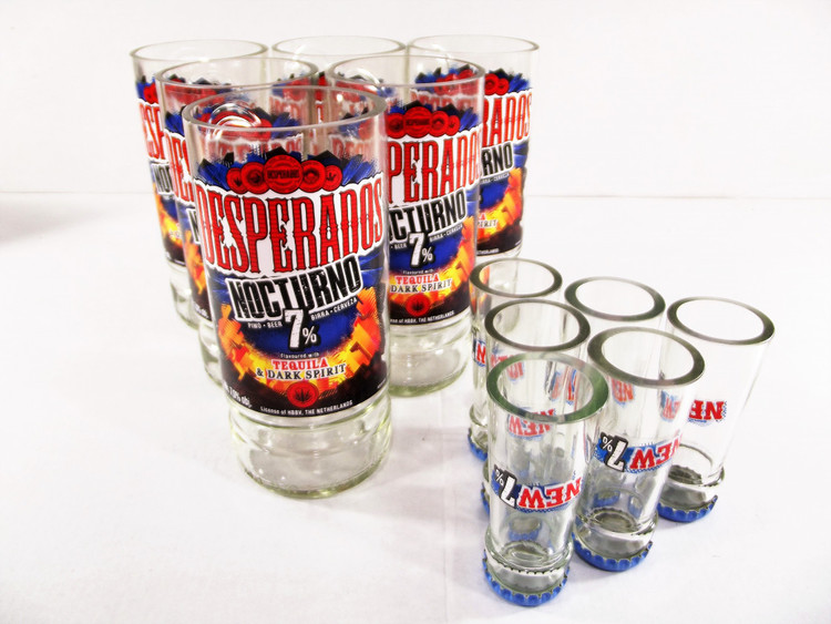 A super unique hand-made set consisting of six glasses and six glass shots.